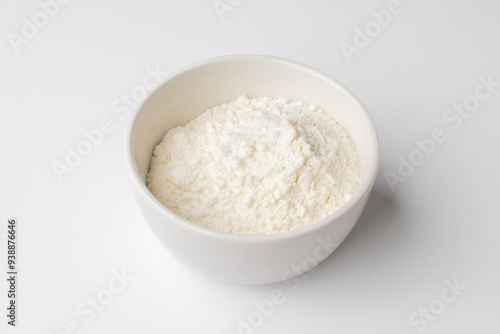Bowl of white cornstarch on a plain background, essential ingredient for baking and cooking during holiday season