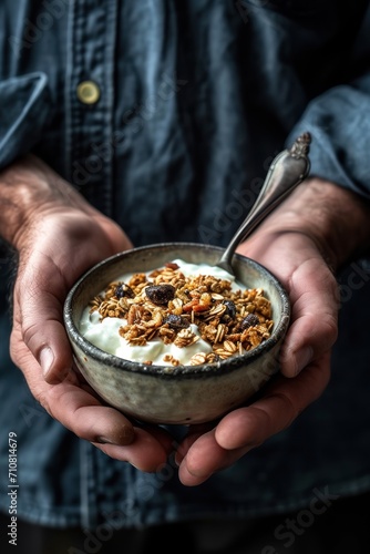 Bowl with healthy breakfast granola and yoghurt with fruits