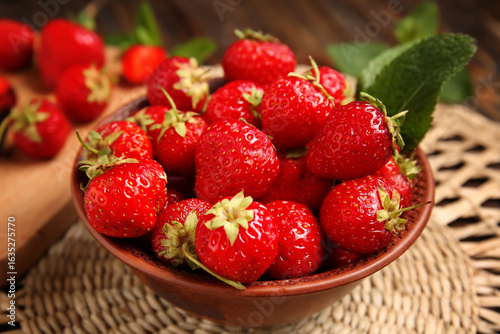 Bowl with sweet ripe strawberries and mint leaf on wooden background, closeup