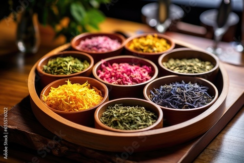bowls of colorful tea leaves on a bamboo tray