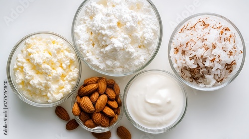 Bowls of cottage cheese, shredded coconut, almonds, and yogurt