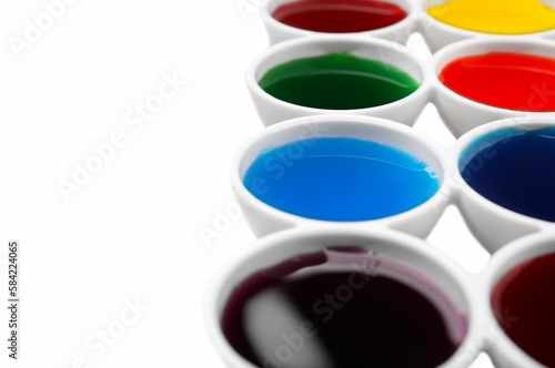 Bowls with many different food coloring on light grey table, closeup. Space for text