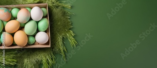 Box filled with colorful Easter eggs on green grass against a dark green background, featuring pastel shades of orange, green, and white.