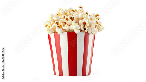 Box of fresh buttered popcorn overflowing and isolated on white background