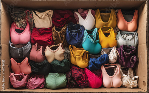 Box of Neatly Folded Bras in Vibrant Colors and Textures, Highlighting Fashion, Intimate Wear, and Organized Storage