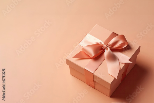 Box With Bow On Light Peach Color Background, Top View, Copy Space. Generative AI