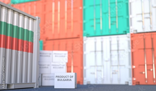 Box with PRODUCT OF BULGARIA text and cargo containers. 3D rendering