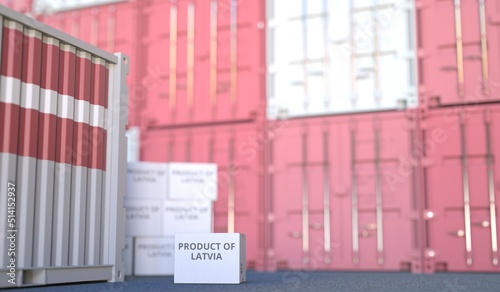 Box with PRODUCT OF LATVIA text and cargo containers. 3D rendering