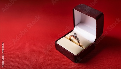 Box with wedding ring isolated on red background, engagement ring, dating ring, valentine's day