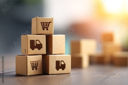 Boxes are stacked with shopping and delivery icons on a wooden surface.