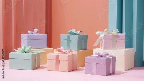 Boxes in various colors with ribbon on a pink backdrop
