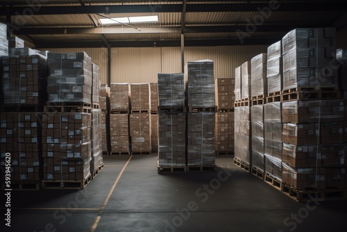 Boxes Of Goods Stacked In Warehouse For Storage. Generative AI