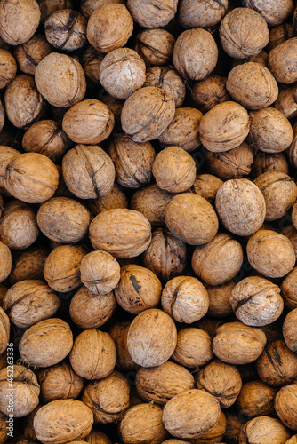 Boxes of ripe walnuts harvested from trees. Agriculture, nuts.