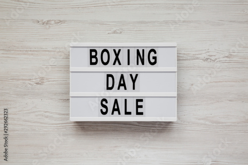 'Boxing day sale' words on a modern board on a white wooden background, top view. Overhead, from above, flat lay.