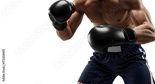 Boxing guard, neck down, plain gear, white studio backdrop.