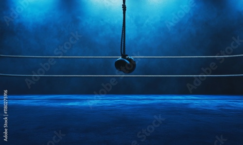 Boxing ring with a rope hanging from the ceiling. The rope is black and the background is blue