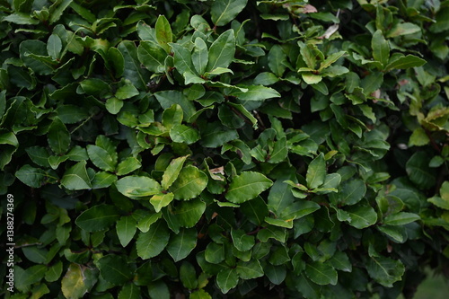 Boxwood hedge with dense green leaves. Natural background of lush evergreen foliage. Perfect for gardening, landscape design, or eco concepts.