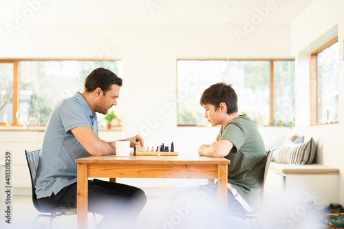 Boy and father playing chess at living room table