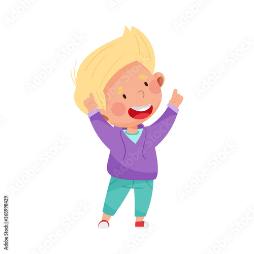 Boy Character with Blonde Hair Pointing at Something with His First Finger Vector Illustration