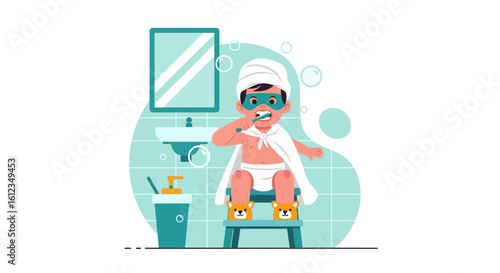 Boy Dressed Like A Superhero Brushing His Teeth In The Bathroom