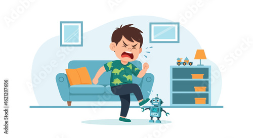 Boy expresses frustration by stepping on a toy robot in the living room setting