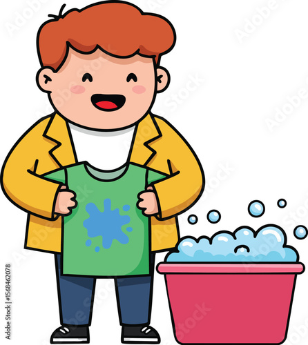 Boy holding clean green shirt next to pink laundry basket with soap suds in cartoon vector style