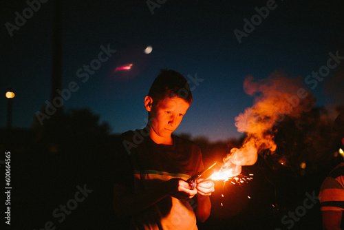 Boy holds a fire sparkler on July 4th in the dark night