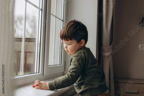 boy in a green shirt lying and playing toy cars on the windowsill