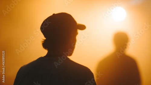 Boy in shadowy silhouette against blazing sunset, introspective contemplation of autumn equinox, urban mystery, ephemeral twilight