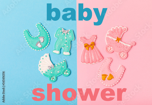 Boy or girl.A set of delicious baby shower cookies on a colorful background. Gender cookies.Baby shower party. Close-up. Flat lay. Place for text.