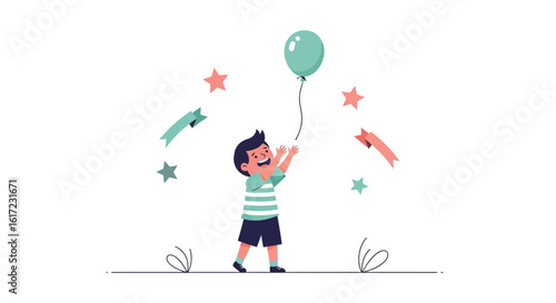 Boy Reaching For a Balloon With Stars and Ribbons In Celebration Mode