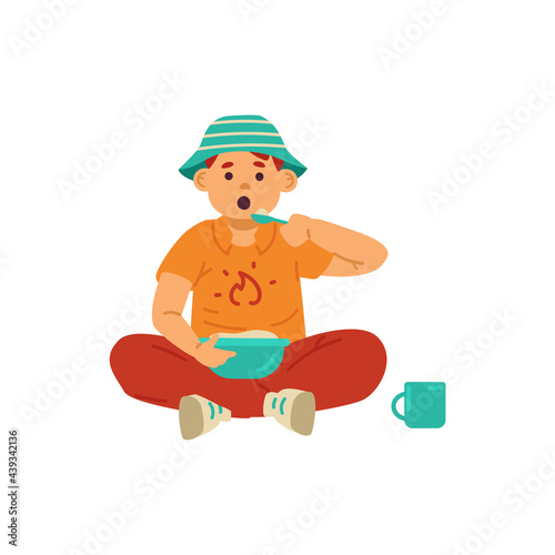 Boy scout eating sitting on ground, flat vector illustration isolated on white.