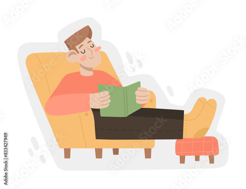 Boy sitting in armchair with book. Cute vector illustration of reading young man