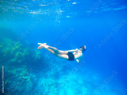 Boy snorkeling dive deep into the blue sea near the coral reef. Red Sea