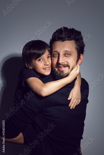 boy son is sitting on his father with a beard and hair back in the studio on a gray background in black clothes.