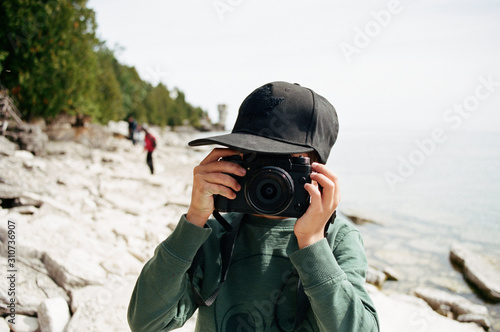 boy taking photos on the beach