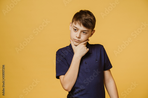 Boy thinking. Young teen thinking of solution isolated on yellow background. Uncertain, doubt expression, confusion, inspiration and solution concept.