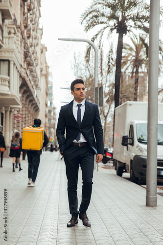 boy walking in town with suit