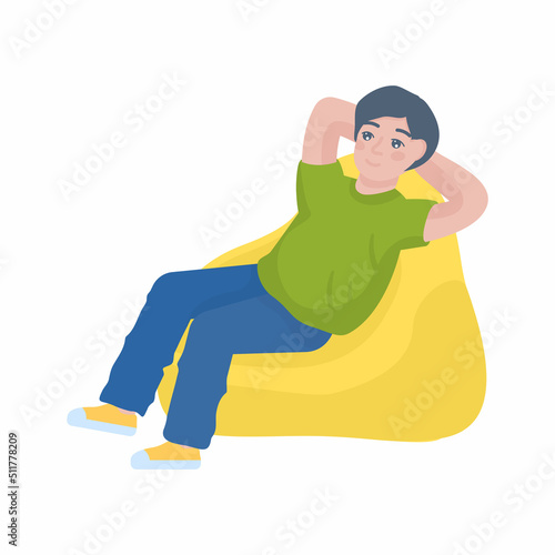 Boy wearing green t-shirt sits in bag chair stretch hands isolated on plain yellow background. Lifestyle concept.