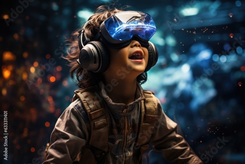 Boy wearing virtual reality headset. VR goggles innovation technology. Generative AI