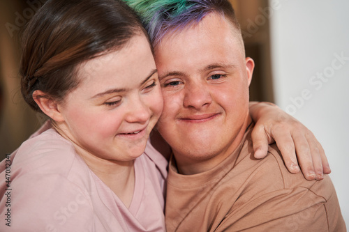 Boy with special needs embracing tight his girlfriend and looking at the camera