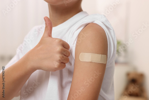 Boy with sticking plaster on arm after vaccination showing thumbs up indoors, closeup