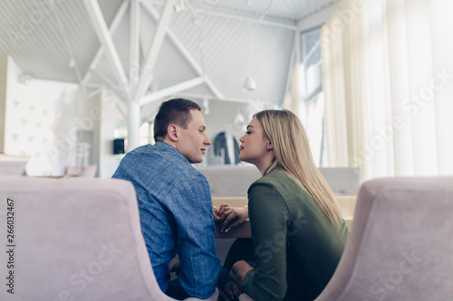 boyfriend and girlfriend enjoy each other indoor. Together forever. Loving Couple on the date in cafe. Happy couple drinking coffee.love story concept
