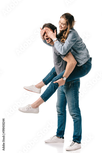 boyfriend giving piggyback to girlfriend and she covering eyes isolated on white