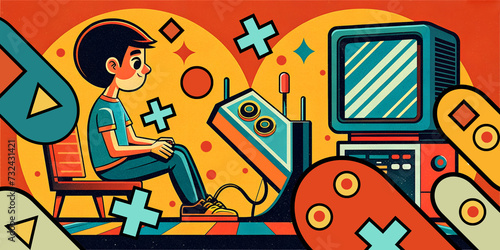 Boys sitting on vintage retro gamepad cabinets and retro style orange background. 90s Games, Retro, Gaming, Video Game Competitions, Website, Game Industry, Illustration