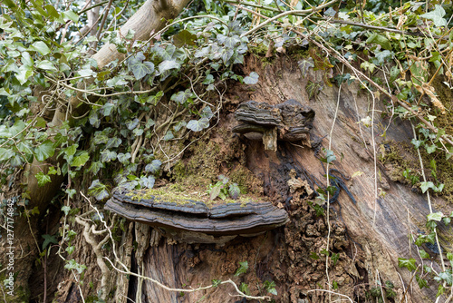 Bracket Fungi Growing on a Decaying Fallen Tree Trunk in Woodland Forest Showing Wood Decay and Symbiosis in Nature