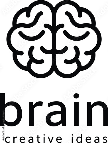 Brain logo vector with “brain” and “creative ideas” text, black stylized brain illustration on white background, isolated intellectual concept artwork for stock use