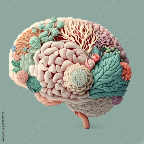 Brain shape. Anatomical brain, rose and pastel flowers. Brain made of flowers. Generative AI