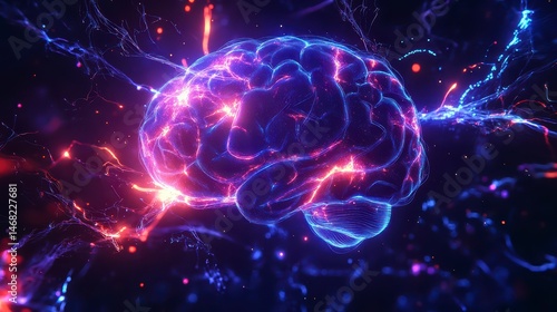 Brain with blue and red lights surrounding it. The brain is surrounded by a blue and red glow