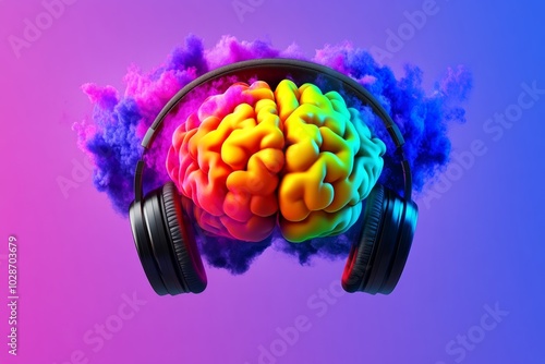 Brain with headphones on it is shown in a colorful explosion. Concept of creativity, as the brain is being transformed into a musical instrument. colorful brain explosion with headphones on the brain